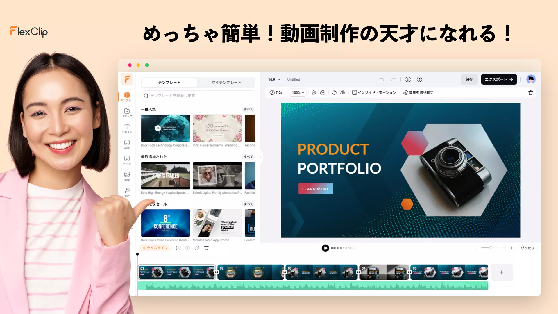 - FlexClipには豊富なテンプレートが用意されているので、CMやまとめ動画的なものが簡単に作れます!